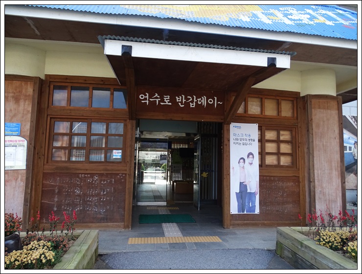 득량역 대합실 입구에는 '억수로 반갑데이~'라는 전라도 사투리 글이 반긴다.