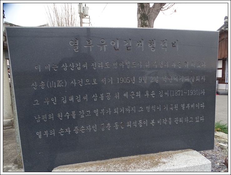 김씨행적비는 상산김씨 전라도 병마절도사 휘 수정의 후손 휘 채호가 산송(山訟) 사건으로 서기 1905년 9월 2일 악한에게 피살되자, 그 부인 김해김씨 삽봉공 휘 세근의 후손 김씨(1871~1930)가 남편의 원수를 갚고 열부가 되기까지 그 행적이 기록된 열부비이다.