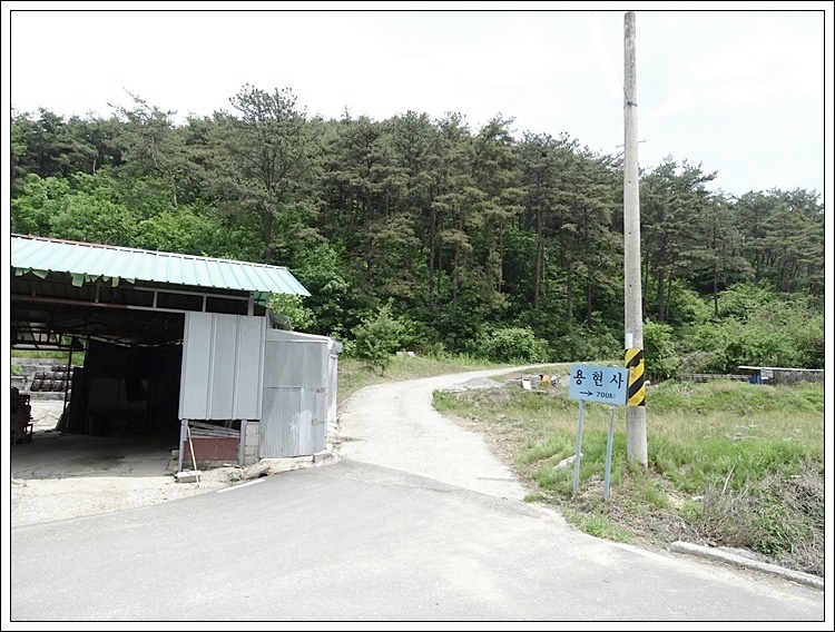 저수지(대도지) 둑을 (소사길: 용현교)을 지나서 용현사 700m라는 푯말이 세워진 곳에서
