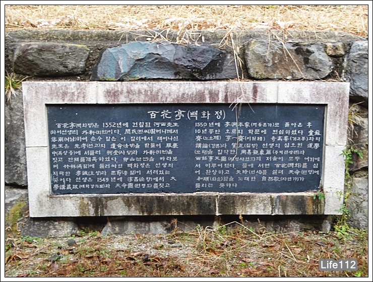 백화정(百花亭)은 1552년에 건립된 하서 선생(河西 先生)의 외헌(外軒)이다. 선생의 본관은 울산이다.